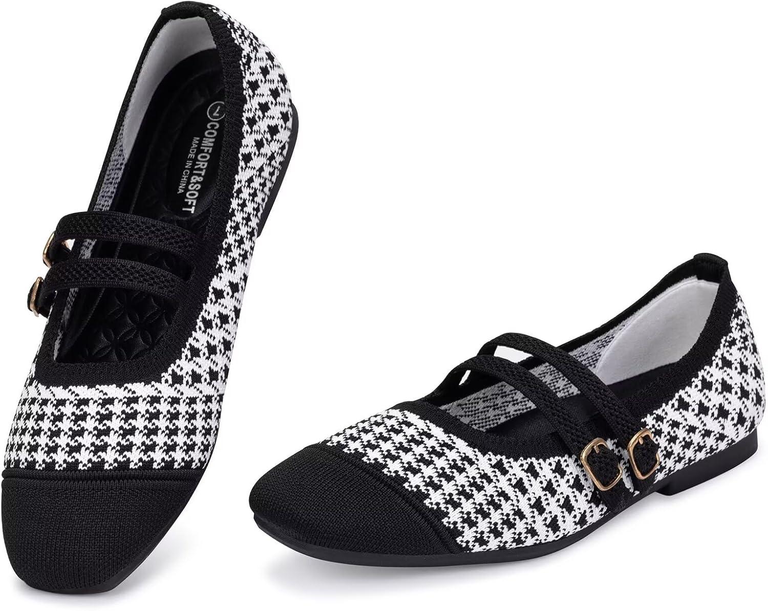 Frank Mully Women’s Flats Square Toe Mary Jane Shoes Ballet Flats with Strap Comfortable Slip On Knit Shoes Dressy Casual(B-white)