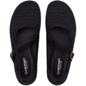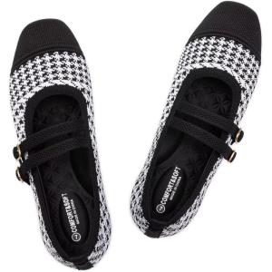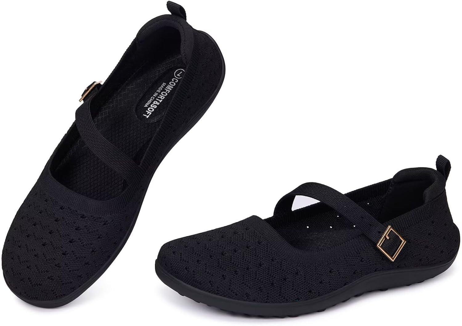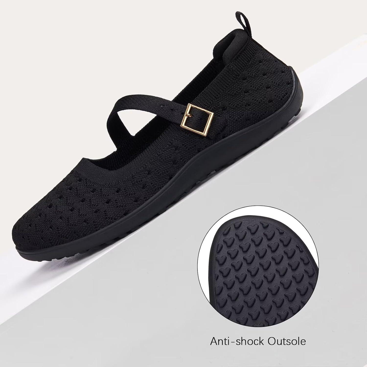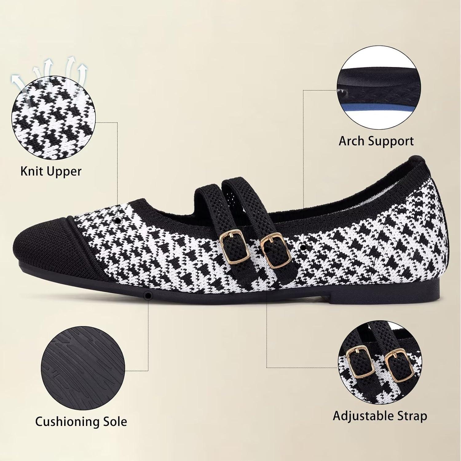 Frank Mully Women’s Wide Width Flats Mary Jane Flat Comofortable Knit Ballet Flat Wide Toe Box Dress Shoes with Adjustable Straps(Black/Mesh)