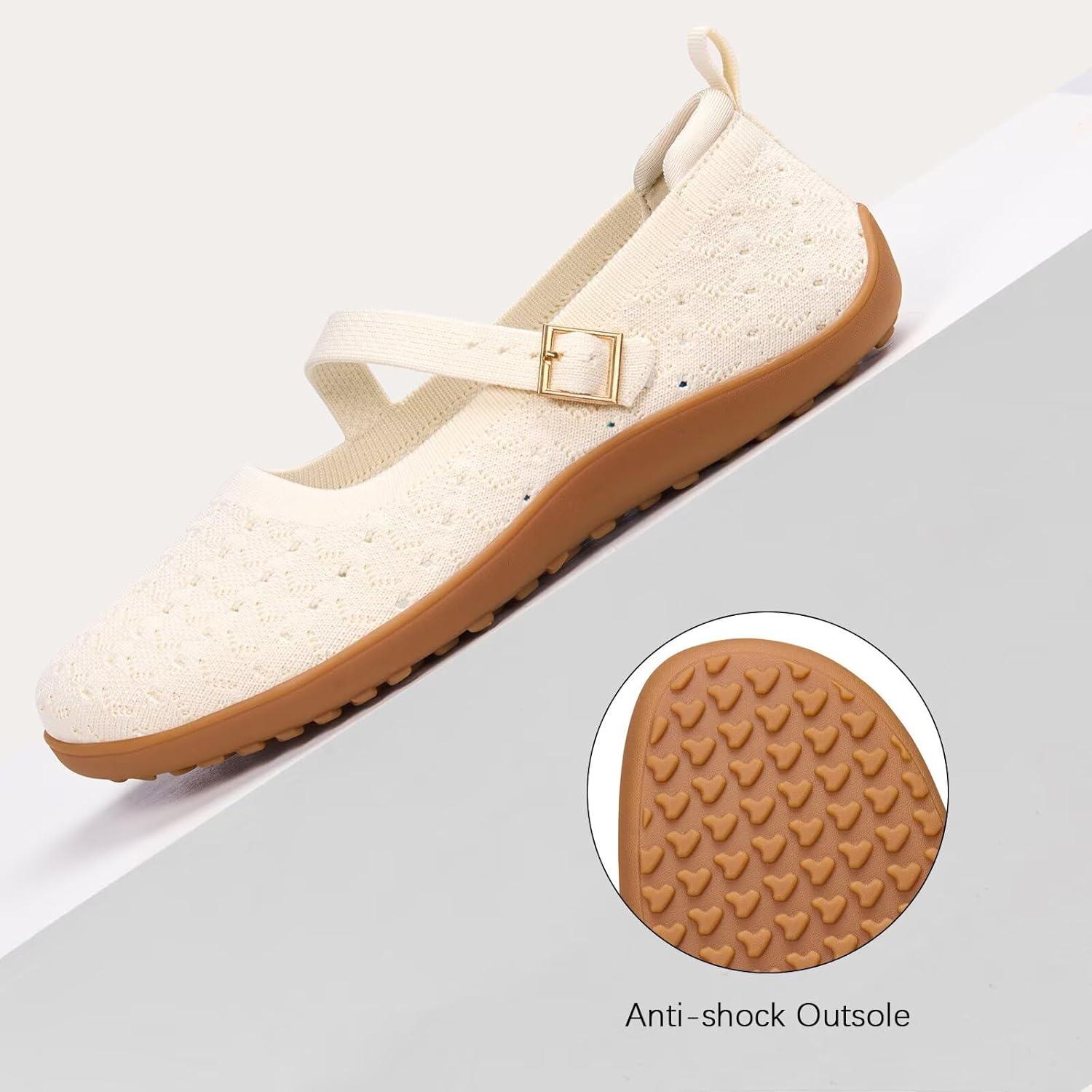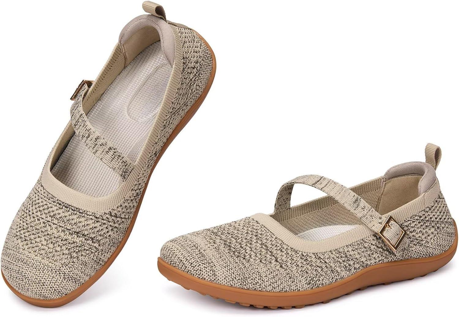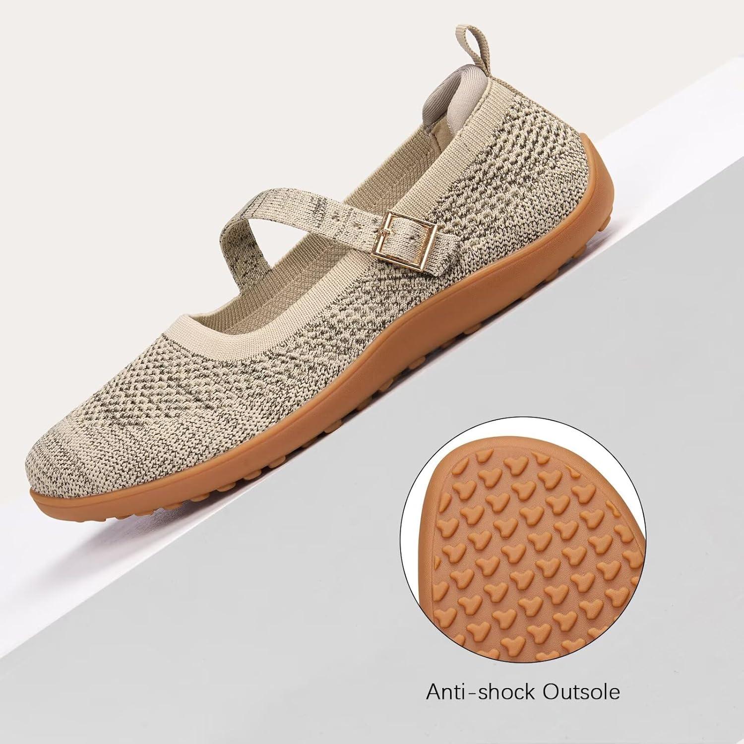 Frank Mully Women’s Wide Width Flats Mary Jane Flat Comofortable Knit Ballet Flat Wide Toe Box Dress Shoes with Adjustable Straps(Beige/Mesh)