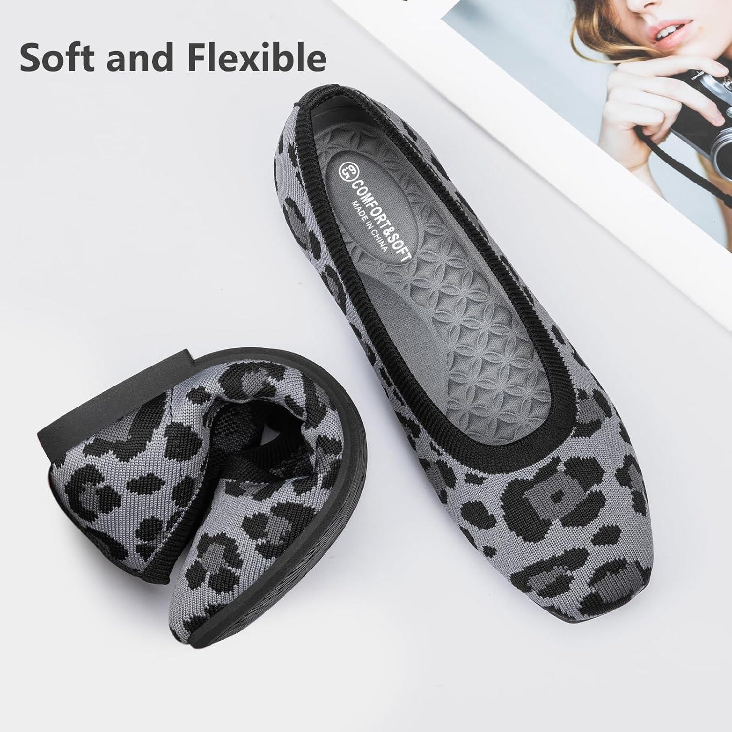 Frank Mully Women’s Flats Square Toe Flats Comfortable Slip on Washable Ballet Flats Shoes for Women Dressy Work(Leopard Grey)