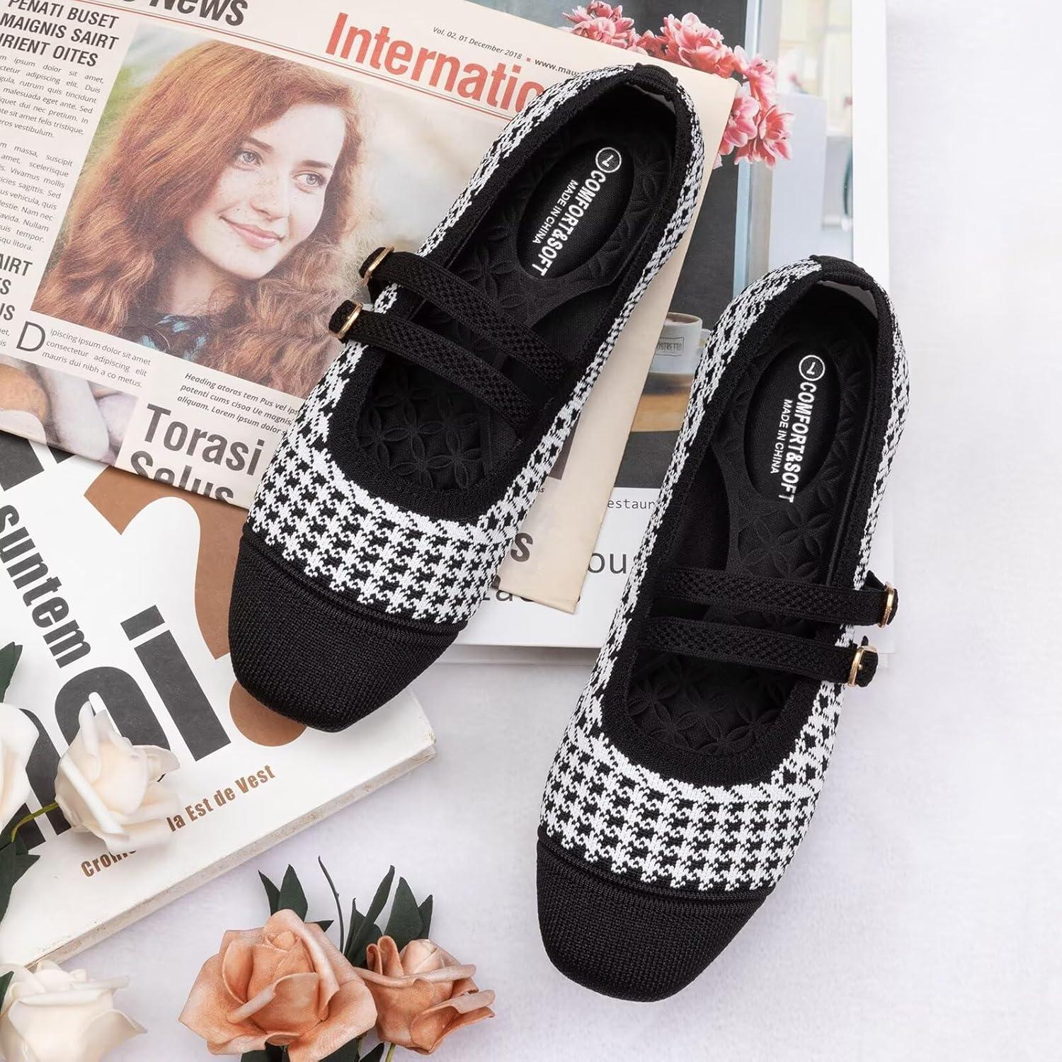 Frank Mully Women’s Flats Square Toe Mary Jane Shoes Ballet Flats with Strap Comfortable Slip On Knit Shoes Dressy Casual(B-white)