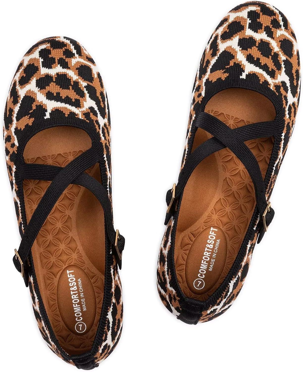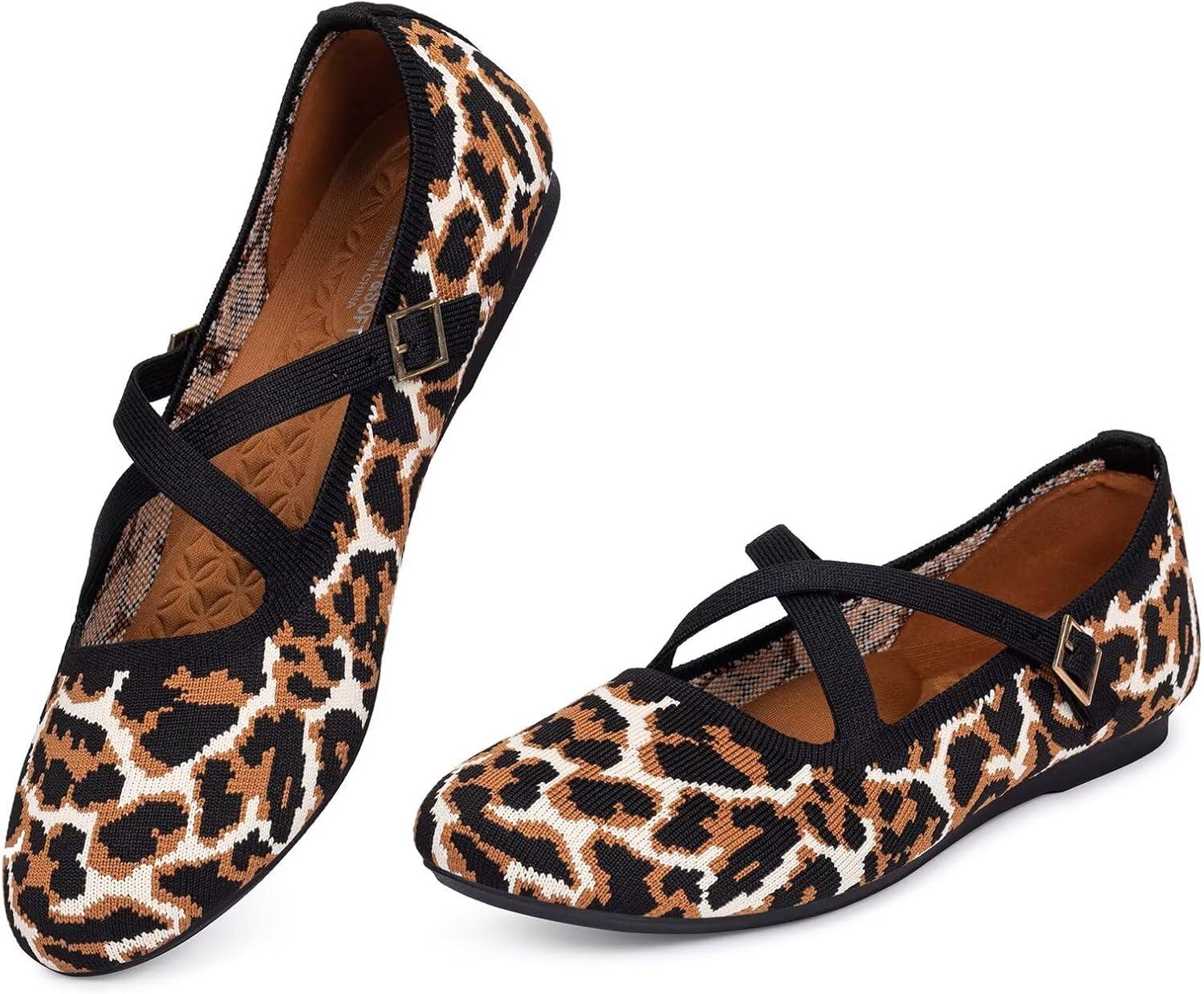 Frank Mully Women’s Mary Jane Flats Knit Ballet Criss Cross Ankle Strap Flat Shoes(Leopard)