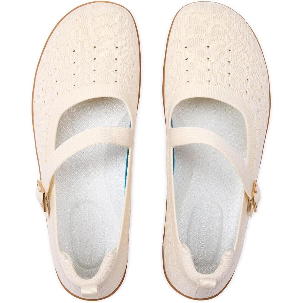 Frank Mully Women’s Wide Width Flats Mary Jane Flat Comofortable Knit Ballet Flat Wide Toe Box Dress Shoes with Adjustable Straps(Beige/Mesh)